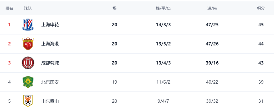 19轮之后,申花以45分排名榜首,海港、蓉城分别以41分、40分排名第2、3位,国安则以39分排名第4位。申花一度以6分领跑,但第19轮被云南玉昆逼平,让申花的积分优势缩小为4分。